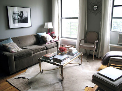 We brought in the glass-top coffee table (a freebie from our grandma) to bring in a material other than wood and, again, lighten up the space. It's hard to see in the pictures, but it also has brass feet...love it!